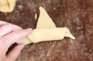 შემდეგ, გამოიღეთ ცომი მაცივრიდან და გააბრტყელეთ რაც შეიძლება თხელ ფენად. თუ კრუასანის საჭრელი ხელსაწყო გაქვთ, გადააგორეთ ცომზე და მიიღებთ გამოჭრილ სამკუთხედებს. თუ არადა მიჰყევით შემდეგ მეთოდს: ქაღალდით გამოჭერით თქვენთვის სასურველი ზომის მართკუთხედი (მოცემულ რეცეპტში გამოყენებულია 15 x 27 სმ-ის მართკუთხედი. შემდეგ დაჭერით ცომი მოცემული მართკუთხედის ზომებად დანით, ან პიცის საჭრელით. თითოეული მართკუთხედი დიაგონალზე გაჭერით და მიიღებთ 2 სამკუთხედს.